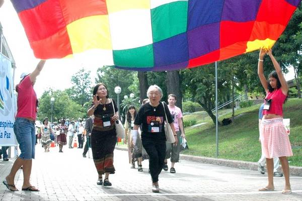 Assembly participants walking through the campus pass underneath an indigenous banner of diversity.
