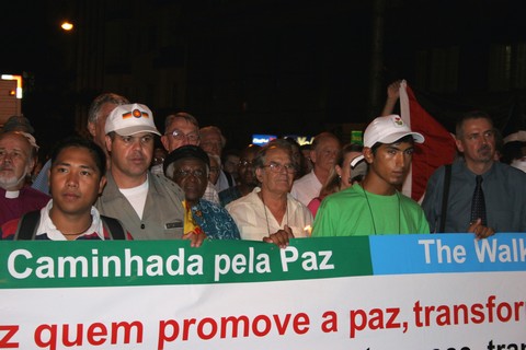 March for peace in Porto Alegre: participants carrying a "Walk for peace-banner"