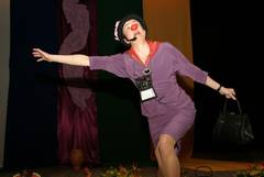 Les confettis oranges et bleus volettent encore à travers la salle lorsque le clown redescend de la scène sur l'air d'un célèbre tube rock.